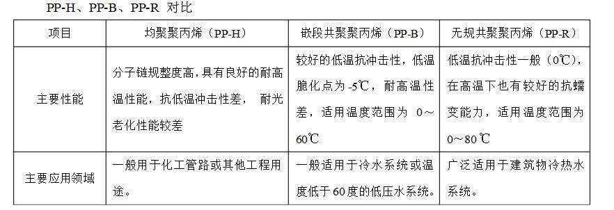 pp管是总称,依据丙烯聚合物的化学组成、分子结构和生产工艺的不同而分为pph、ppb、ppr管。聚丙烯管分为均聚聚丙烯(PP-H)、嵌段共聚聚丙烯(PP-B)和无规聚丙烯(PP-R)3种。三种PP管材中,管材抗冲击性能PP-R>PP-B>PP-H,管材热变形温度PP-H>PP-B>PP-R,管材刚性PP-H>PP-B>PP-R,管材常温爆破温度PP-H>PP-B和PP-R,管材耐化学腐蚀性PP-H>PP-B和PP-R。相对于其他PP管材,PP-R管材的突出优点是既改善了PP-H的低温脆性,又在较高温度下(60℃)具有良好的耐长期水压能力,特别是用于热水管使用时,长期强度均较PP-H和PP-B好。